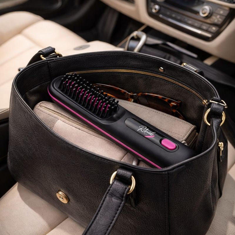Cheveux sous contrôle, en 2 minutes, sans prise, sans stress, une brosse lissante sans fil, pensée pour le rattrapage hors maison.